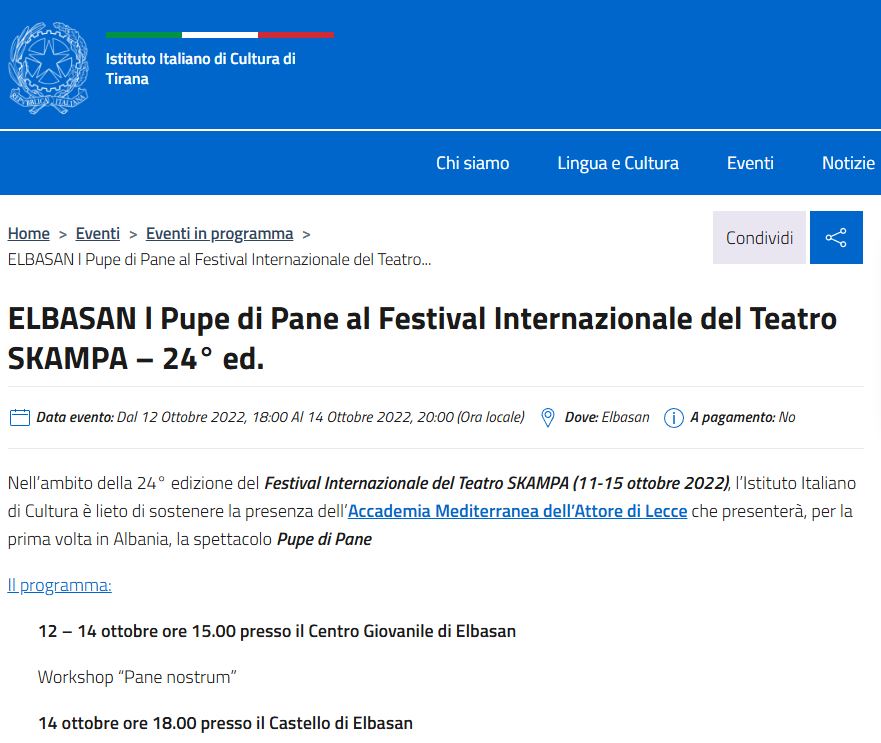 The Italian Cultural Institute in Tirana announces the participation of the Italian performance Le Pupe di Pane at the Skampa International Theatre Festival in Elbasan.