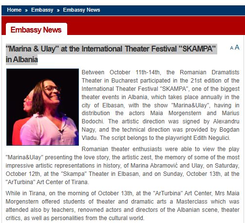 The Embassy of Romania in Tirana announces the International Theatre Festival Skampa as a major cultural event, highlighting its role in promoting international artistic dialogue and cooperation.
